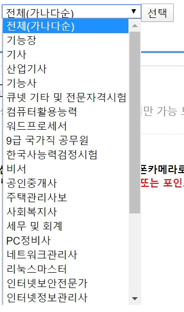 기능사/산업기사/기사/기능장/전문자격시험/컴활/워드/공무원 등등 1차적인 분류를 시작합니다.