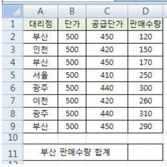 ② =SUMIF(A2:A9,"부산",D2:D9)