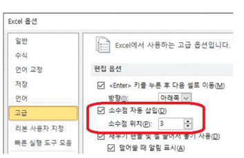 34. 다음 중 아래 그림과 같이 소수점 자동 삽입의 소수점 위치를 '3'으로 설정한 상태에서 숫자 5를 입력하였을 때 화면에 표시되는 결과로 옳은 것은?