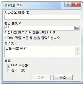 ① [데이터]-[데이터 도구]-[가상 분석]-[시나리오 관리자]대화상자에서 [추가] 단추를 클릭하면 표시되는 대화 상자이다.