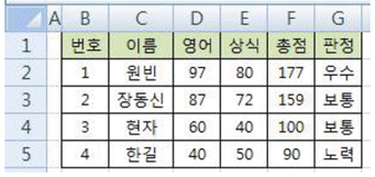 29. 다음 중 판정[G2:G5] 영역에 총점이 160 이상이면 '우수', 100 이상 160 미만이면 '보통', 100 미만이면 '노력'으로 입력하려고 할 경우 [G2] 셀에 입력할 수식으로 옳은 것은?