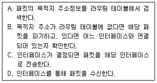 49. 다음은 라우터의 경로배정(routing) 과정을 요약한 것이다. 라우팅 하는 과정을 순서대로 나열한 것은?