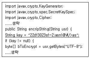 97. 다음 JAVA코드에서 밑줄로 표시된 부분에는 어떤 보안 약점이 존재하는가? (단, key는 암호화 키를 저장하는 변수이다.)