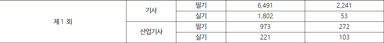 1회차 기사 필기 합격률은 6,491명 중 2,241명 합격으로 34% 합격률이며