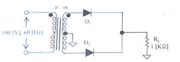 다음과 같은 정류회로에 사용된 다이오드의 최대 역전압(PIV)는 10[V]이다. 100[V], 60[Hz]의 피크 정현파가 입력될 때, 정상적인 회로 동작을 보장하기 위한 최대 권선비는? (여기서, n은 1차측 권선비이고 m은 2차측 권선비이다.)