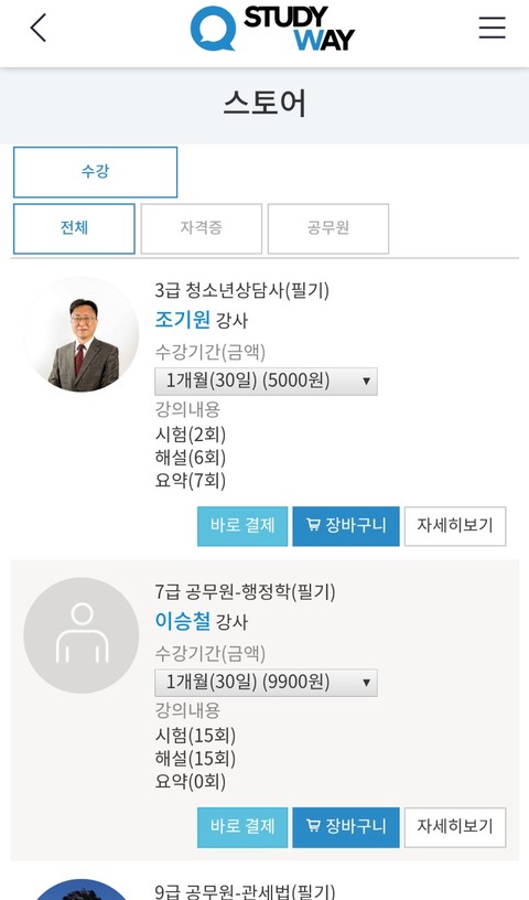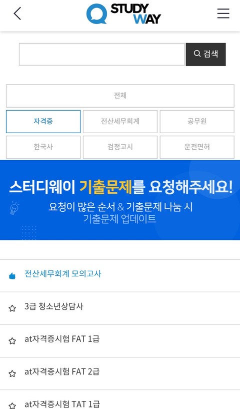 스터디웨이 어플은 자격증 / 공무원 / 전산세무 및 회계 / 한국사 / 검정고시 / 운전면허