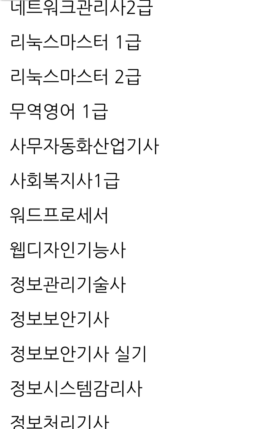 리눅스 마스터 , 네트워크 관리사 , 사무자동화산업기사 있네요 ㅎㅎ